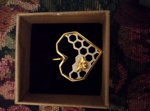 silver with golden bee. The perfect petite accessory for stacking. In many