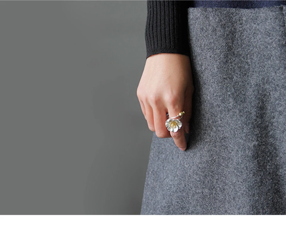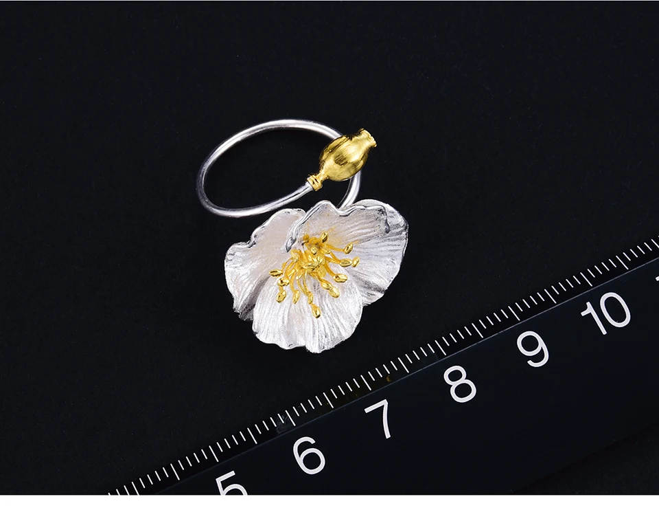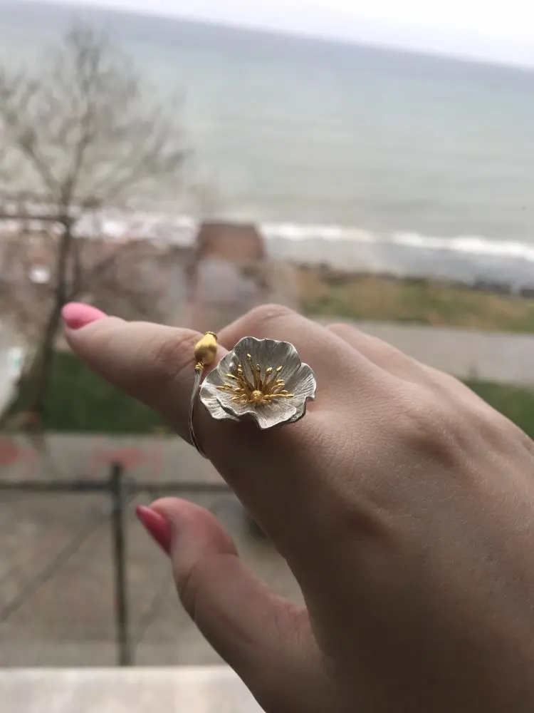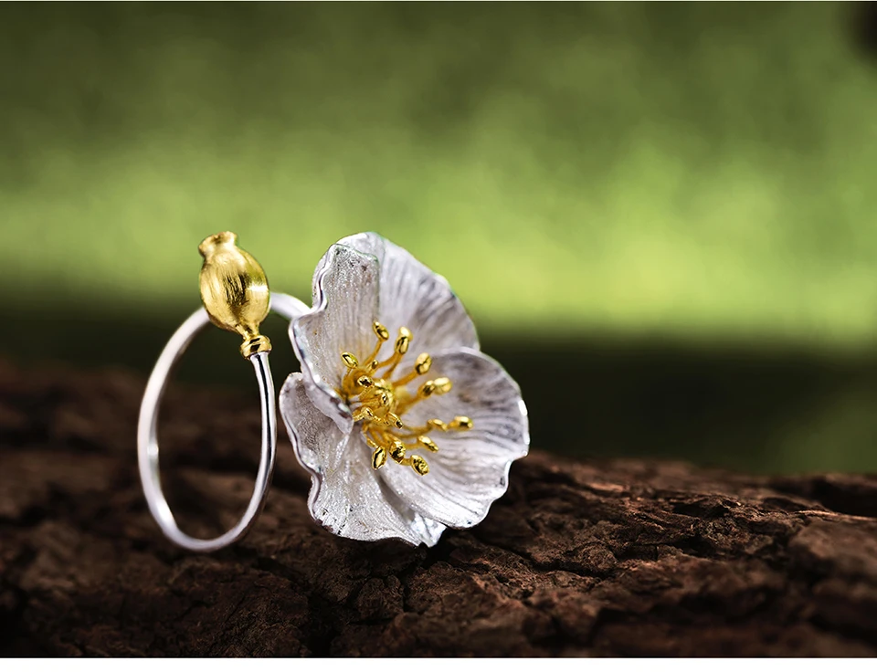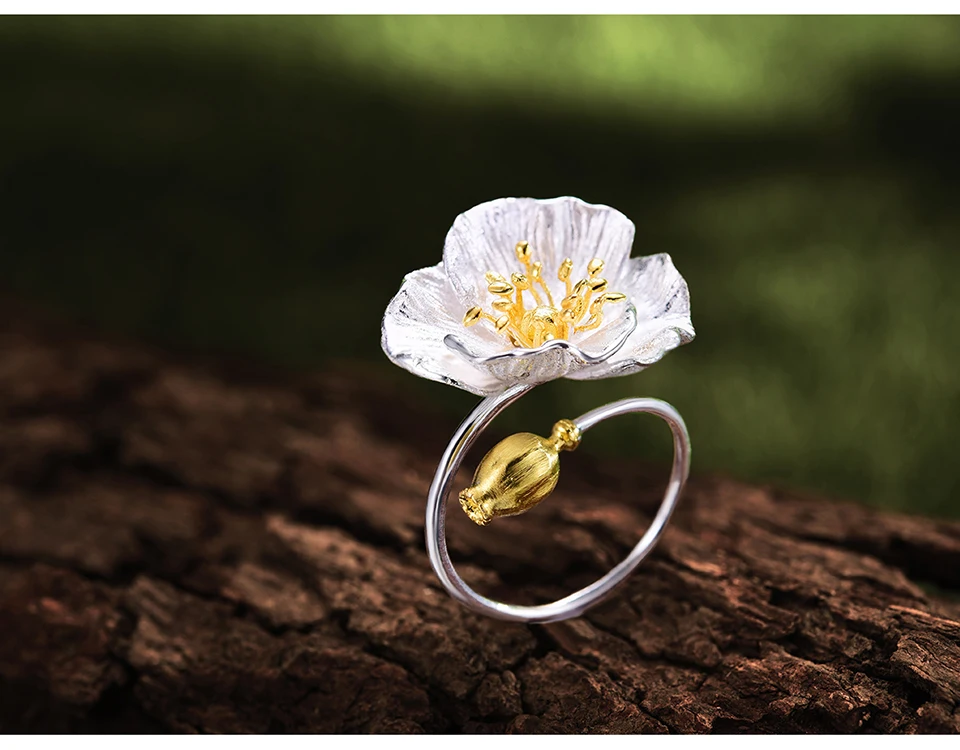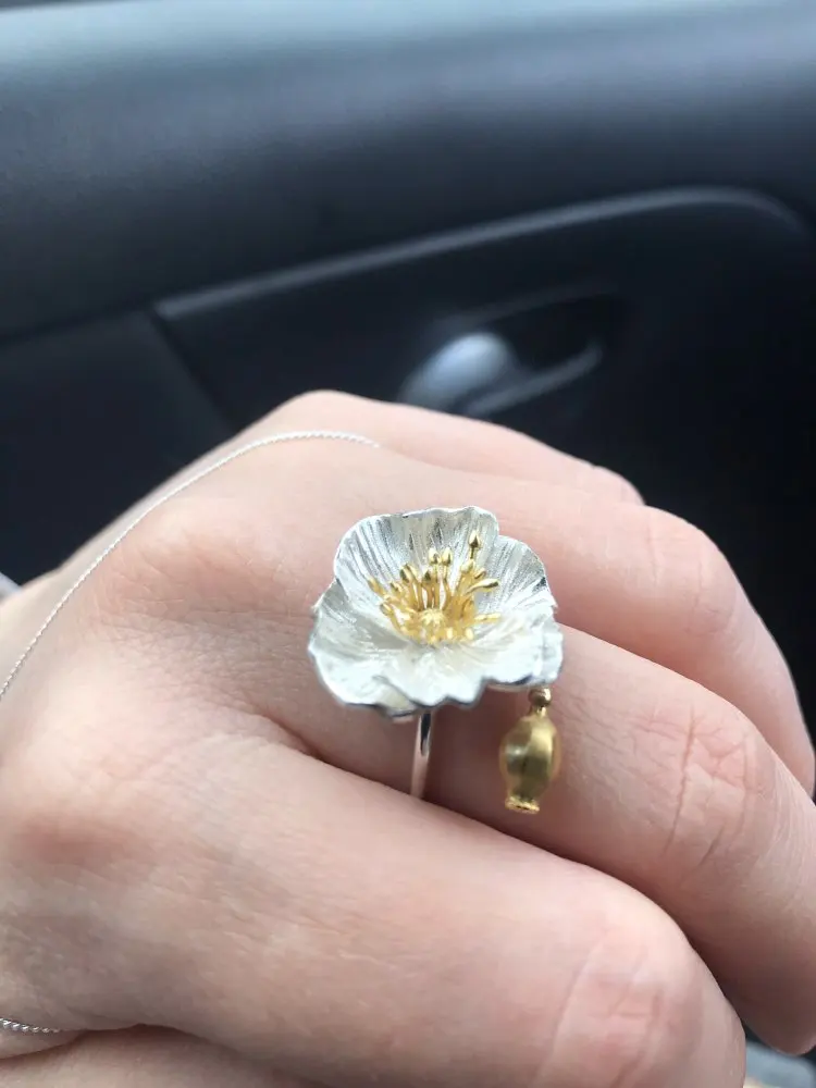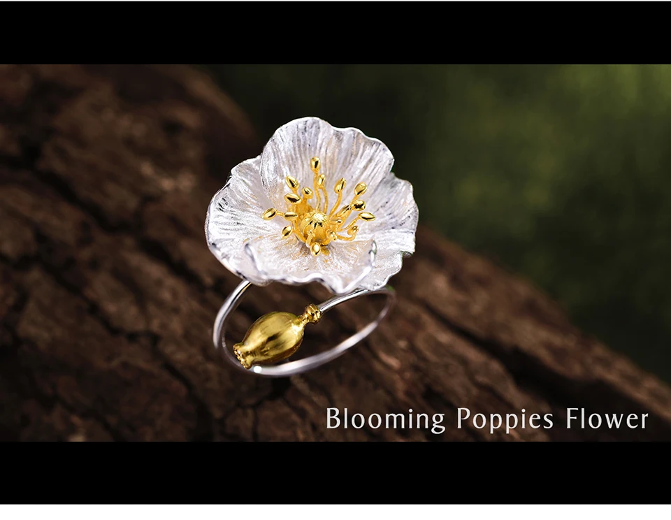 This real poppy flower open ring features a vivid poppy flower. Flower and bud made from genuine solid 925 sterling silver and stamped as S925. Lead and Nickel safe.